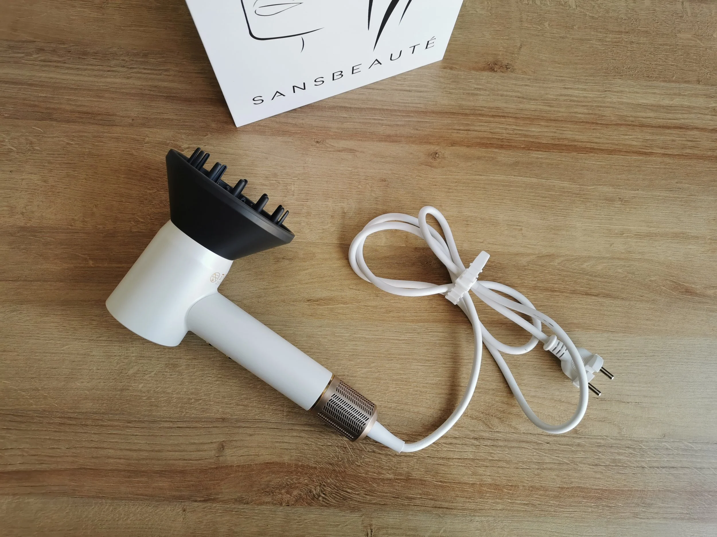 De diffuser van Sansbeauté komt in een stijlvolle witte verpakking - altijd een pluspunt voor een goede eerste indruk. Naast de föhn zelf zitten in de verpakking twee concentrator opzetstukken, de diffuserkop en een ophangsysteem om de föhn aan de muur op te kunnen bergen.